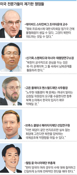본보는 8, 9일 미국의 한반도 전문가 8명에게서 남북 정상회담이 북핵 문제 및 한미관계에 미칠 영향에 관한 의견을 들었다. 이들이 집중 제기한 5대 논란거리를 소개한다.