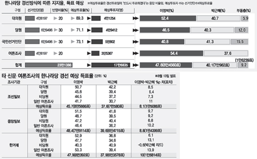 표차는 1만5086표였다. 중앙일보와 한겨레신문도 이 전 시장의 예상 득표율이 박 전 대표의 예상 득표율보다 각각 8.8%포인트, 10%포인트 앞섰다.