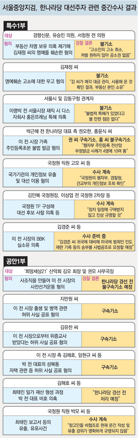 검찰 내에서는 완벽하게 수사가 마무리되지 않은 부분이 있는 만큼 수사 결과 발표를 경선 이후로 미루거나 기소 시점에 맞춰 사건 별로 수사 내용을 밝히는 방안 등도 검토됐으나 검찰은 결국 ‘전격 중간수사 발표’라는 ‘정공법’을 선택했다.