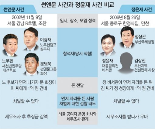 ▽돈 받는 현장엔 대통령도, 비서관도 없었다=2002년 11월 9일 서울 강남의 R호텔에서 조찬 모임이 열렸다. 참석자는 새천년민주당 대선후보였던 노무현 대통령, 대선 캠프 실무자였던 이광재 대통합민주신당 의원, 노 대통령의 부산상고 동문인 썬앤문그룹 문병욱 회장 등이었다.