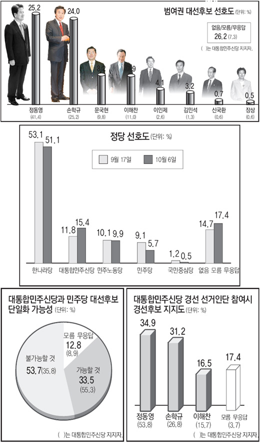 한나라당 지지도는 대선후보 경선 직후인 8월 20일 58.2%를 기록했으나 이후 조정세이고, 대통합민주신당의 경우 옛 열린우리당을 흡수 합당한 직후인 8월 12일 지지도 5.3%에서 꾸준히 오르는 추세다.