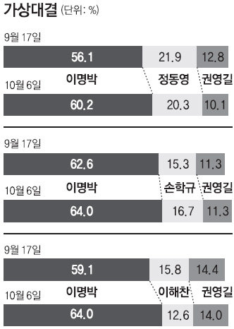 손 전 지사가 대통합민주신당 후보로 나설 경우에는 이 후보와의 지지도 차가 47.3%포인트로 조사됐다. 이 가상대결에서 대통합민주신당 지지층은 35.8%만이 손 전 지사를 지지했으며, 34.4%는 이 후보를 지지하겠다고 응답했다.