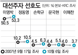 본보가 여론조사 전문기관인 코리아리서치센터(KRC)에 의뢰해 6일 전국 성인 1000명을 대상으로 실시한 이번 조사에서 이명박, 범여권 정동영, 민주노동당 권영길 후보의 가상대결은 ‘60.2% 대 20.3% 대 10.1%’로 나타났다.
