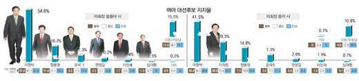 한나라당 이명박 대선 후보는 이 전 총재가 출마하더라도 보수 성향 응답자 가운데 절반 이상의 지지를 얻었으며 중도 성향과 진보 성향에서도 40% 가까운 선호를 얻는 것으로 조사됐다.