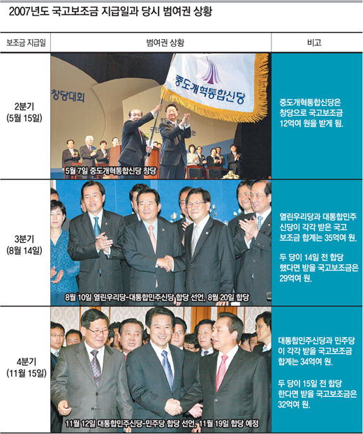 3분기 지급일(8월 14일) 직전인 8월 10일에는 대통합민주신당과 열린우리당이 합당을 선언했다. 두 당은 3분기 지급일에 각각 열린우리당 19억6000여만 원, 대통합민주신당 15억4600여만 원을 받아 도합 35억여 원을 받고 나서 6일 뒤인 20일 합당했다.