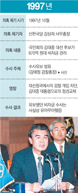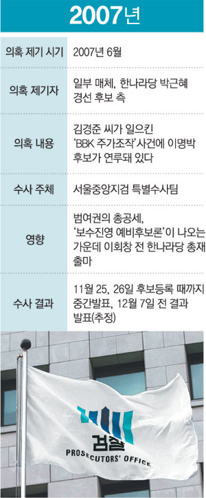 1997년에는 10월 중순, 2002년에는 8월 초순에 검찰이 본격적인 수사 개입 여부를 결정했지만, 이번에는 대선을 코앞에 둔 11월 중순이라는 점이 다르다.》
