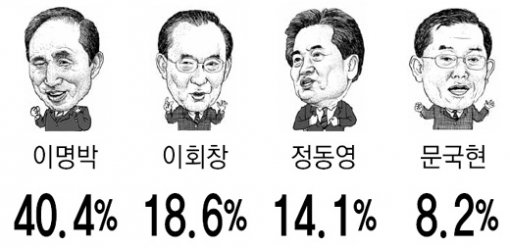본보가 여론조사 전문기관인 코리아리서치센터(KRC)에 의뢰해 17일 전국 성인 1500명을 대상으로 실시한 이번 조사에서 이명박 후보와 이 전 총재, 정동영 권영길 후보의 4자 가상대결 시 지지도는 41.5% 대 20.5% 대 18.5% 대 4.8%였다.