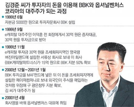 환은살로먼스미스바니 등 유명 증권회사에서 ‘투자의 귀재’로 불렸던 김 씨는 1999년 6월에 투자자문회사 BBK를 설립했다. 2001년 4월에는 창업투자회사인 광은창투를 인수해 옵셔널벤처스코리아라는 회사의 대주주가 됐다. 김 씨는 두 회사의 지분을 대부분 가진 대표이사를 지냈다.