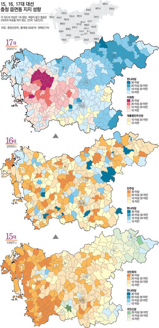 32개 충청 지역 시군구 중 14대 때는 90.6%(29개)가 김영삼 대통령, 15대 때는 84.4%(27개)가 김대중 대통령, 16대 때는 90.6%(29개)가 노무현 대통령을 많이 찍었다. 전국 민심을 충청도가 대변한다는 통념이 수치로 확인된 셈이다. 충남이 고향인 이회창 후보의 출마로 다소 줄긴 했지만, 이번 대선에서도 34개 충청 지역 시군구 중 25개(73.5%)가 이명박 당선자를 1위로 꼽아 당선자 적중률이 높았다.