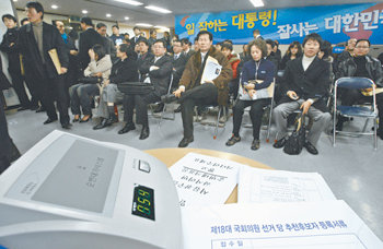 이날 여의도 당사 주변은 장사진을 이뤘다. 수백 명의 공천 신청자와 측근 지지자들이 한꺼번에 몰려들어 늦은 밤까지 순서를 기다리느라 인근 식당과 커피숍은 빈자리가 없을 정도였다. 14명의 당직자가 접수 업무에 매달렸지만 밀려오는 공천신청 대열을 감당하기엔 턱없이 부족했다.