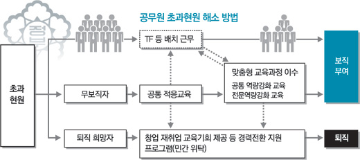 초과현원을 어떻게 처리할지 구체안으로 △일반직은 기한을 정하지 않고 해소될 때까지 초과현원 인정 △계약직은 계약기간 동안은 과원을 인정하되 계약 완료 시 해지 △별정직은 기존 업무 마무리와 신분 전환 필요기간을 인정해 6개월의 기간을 준 뒤 해지 등을 명시한 바 있다.