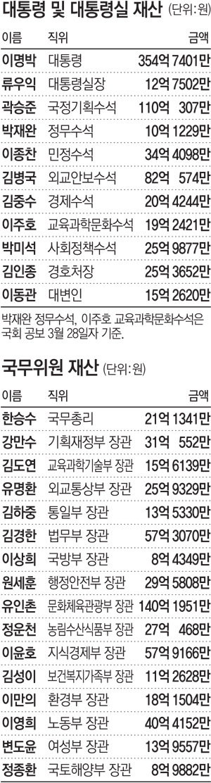 한승수 국무총리와 장관 등 국무위원 16명의 재산은 평균 32억5327만 원이었다. 류우익 대통령실장 등 대통령비서진 10명은 평균 35억5652만 원을 신고했다.