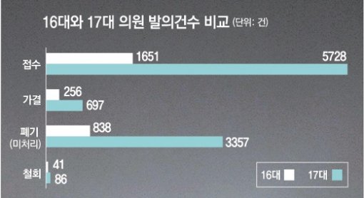 ▽17대 국회 외화내빈(外華內貧)=17대 국회의원 발의 건수는 16대 1651건에서 17대 5728건으로 3.5배로 늘어났다. 그러나 가결된 건수는 16대 256건, 17대 697건으로 2.7배로 늘어난 데 비해 미처리로 폐기된 건수는 16대 838건에서 17대 3357건으로 4배로 늘었다. 한 건의 법안도 가결시키지 못한 의원도 98명에 이르렀다.