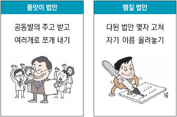 국회의원 보좌진 사이에서는 입법과 관련해 이런 용어들을 많이 쓴다. ‘품앗이 법안’은 의원들이 서로 공동발의를 해 주는 법안이고 ‘땜질 법안’은 용어 한두 개만 교체하는 손쉬운 법안 발의, ‘우회 입법’은 정부가 의원을 통해 대신 발의하는 것을 뜻한다.
