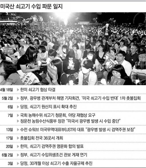 쇠고기 협상에는 한미 자유무역협정(FTA) 조기 비준이나 대미 관계 개선 등 다양한 정치·경제적 함의가 담겨 있지만 지금은 ‘캠프 데이비드 숙박료’ 정도로 인식되고 있다. 정부가 국제수역사무국(OIE) 기준 등을 내걸며 협상의 당위성만 강조하다보니 이면의 가치를 이해시키는 데 실패했다는 분석이다.