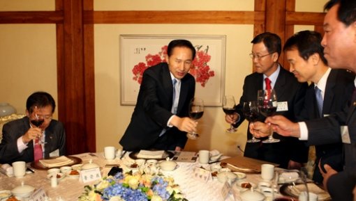 이 대통령은 인사말에서 “세계 경제가 매우 어려운데 평상시는 그렇다 치더라도 위기 앞에서는 여야가 따로 없다”며 “대한민국의 어려움을 극복하기 위해 여야가 원만한 합의를 이루고 생산적 국회가 되자”며 건배를 제의했다.