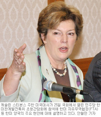 캐슬린 스티븐스 주한 미국대사는 25일 “(한미) 양국 정부가 (새해부터) 함께 노력해야 할 것 중 첫째가 경제위기 관점에서 한미 자유무역협정(FTA)을 위한 길을 만드는 것”이라고 말했다.