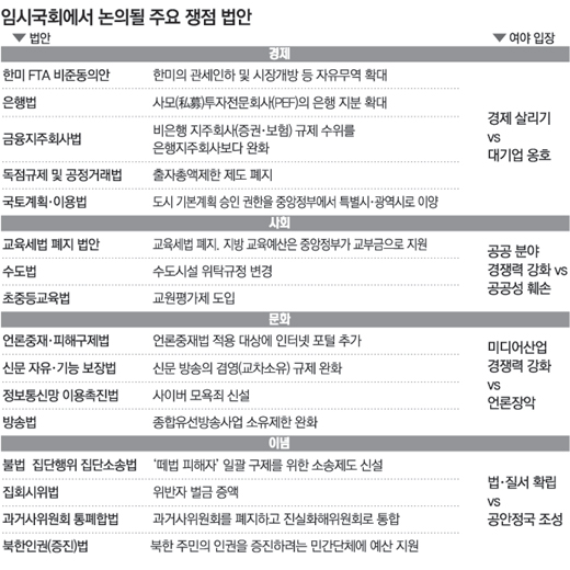 당장 한나라당은 이번 주 중에 한미 자유무역협정(FTA) 비준동의안을 외교통상통일위에 상정할 계획이다. 야당은 각종 규제완화 법안에 대해 ‘대기업 옹호 정책’이라며 반발하고 있다.