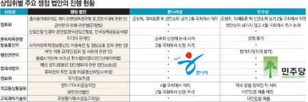그나마 출자총액제한제와 금산분리 관련법을 처리해야 하는 정무위가 비교적 순항 중이다. 정무위는 여야 간사 합의를 통해 의사일정에 합의했다. 공청회도 열리고 있다. 그러나 법안 심사 일정이 회기 막판에 잡혀 있고 민주당이 금산분리 완화 관련법 처리에 강력히 반대하고 있어 쟁점법안의 상임위 통과 여부는 불투명하다.