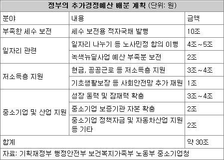 4일 기획재정부와 행정안전부, 노동부, 보건복지가족부, 중소기업청 등에 따르면 정부는 경기 부양을 위해 30조 원 규모의 추경 편성안 초안을 마련해 막바지 조율에 착수했다.
