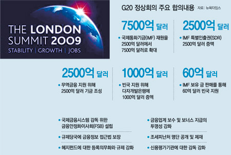▽성과1: 국제통화기금(IMF) 재원 확충=뉴욕타임스는 G20 정상회의가 낳은 가장 구체적인 결실로 IMF의 재원을 5000억 달러 늘려 7500억 달러로 확충하기로 한 것이라고 평가했다. IMF 재원을 대폭 확충함으로써 특정 국가가 처한 위험을 조기에 경보하고 G20이 금융규제와 관련한 약속을 제대로 지키는지 등을 평가하는 새로운 역할을 맡기겠다는 것이라고 월스트리트저널은 분석했다.