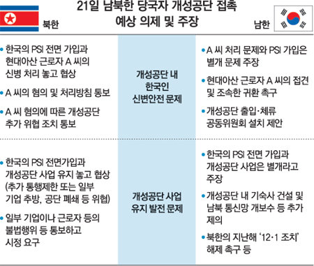 북한은 통지문에서 의제가 ‘개성공단 사업과 관련된 것’이며 ‘중대한 사안’이라는 단서만 던졌다. 이에 따르면 북측이 내놓을 의제는 크게 두 가지로 압축된다. 하나는 19일까지 개성공단 현지에 21일째 억류돼 조사를 받고 있는 현대아산 소속 40대 A 씨의 신변에 관한 내용일 경우다. 다음은 개성공단 사업에 관한 포괄적인 정책 선언 또는 구체적인 사안에 대한 문제 제기일 경우다. 그러나 북한이 개성공단 문제를 남한의 대량살상무기 확산방지구상(PSI) 문제와 연관시킬 경우 사안은 좀 복잡해질 것으로 전망된다.
