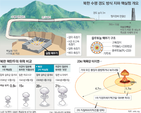 1차땐 폭발력 0.8kt… 이번에는 20kt ○ 北의 핵 기술력은? 90년대 기폭장치 개발…연구인력 3000명 확보 ○ 미사일 탑재 추진 발사 정확도 높인후 3차 핵실험 할 가능성 북한이 25일 실시한 2차 핵실험으로 핵보유국 반열에 오르게 될까. 정부와 학계에 따르면 북한은 일단 2006년 10월 1차 핵실험 때보다 폭발 위력을 크게 향상시킨 것으로 분석된다. 이상희 국방부 장관은 북한이 이번 핵실험을 통해 확보한 폭발력은 최대 20kt(킬로톤·1kt은 TNT 1000t에 해당하는 폭발력)에 이를 것이라고 밝혔다. 2006년 1차 핵실험 때보다 25배나 폭발력이 커진 것이다. 1차 핵실험 당시 북한은 4kt의 폭발력을 기대했으나 실제로는 0.8kt에 그친 것으로 정부는 추정했다.
