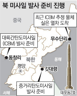 아사히신문과 요미우리신문에 따르면 장거리 탄도미사일을 운반하는 열차가 최근 평양 근처 군사시설에서 무수단리 미사일 기지로 이동했다. 평양 근처의 군사시설은 지난달 동창리 기지로 운반된 ICBM 추정 물체를 보관하고 있던 장소다. 무수단리는 2006년 7월 미사일 발사와 올해 4월 5일 로켓 발사가 이뤄졌던 곳이다.