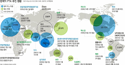 페루, 호주와의 FTA 협상도 각각 3월과 5월에 시작됐다. 정부는 두 나라 모두 광물자원이 풍부해 수출과 자원 확보에 도움이 될 것으로 보고 있다. 막바지 단계에 접어든 한-캐나다 FTA 협상도 관심사다. 캐나다가 비교적 경제규모가 크다는 점에서 주목을 받고 있지만 최근 쇠고기 금수(禁輸) 조치와 관련해 한국을 세계무역기구(WTO)에 제소한 점이 타결의 걸림돌이다.