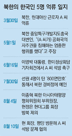 김정일 국방위원장은 4일 빌 클린턴 전 미국 대통령을 평양에 불러들여 여기자 2명을 석방한 데 이어 10일 현정은 현대그룹 회장을 초청함으로써 개성공단 근로자 A 씨 문제도 풀겠다는 뜻을 내비쳤다.