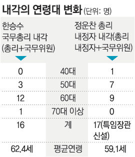 한승수 국무총리(73)의 내각은 한 총리를 포함해 평균 연령이 62.4세였다. 60대 이상이 16명 중 13명을 차지했고 50대는 3명에 불과했다. 반면 정운찬 총리 내정자(63)가 이끌 내각은 평균 나이가 59.1세로 직전 내각에 비해 세 살 정도 젊어졌다. 60대 이상이 9명으로 가장 많지만 40, 50대도 8명에 달한다.