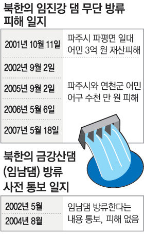 “군사적 문제” “폭우탓” 발뺌 남북한은 2000년 1차 정상회담 이후 몇 차례 임진강 수해 방지를 위한 당국간 협력 방안을 논의한 적이 있지만 ‘말’만 무성했을 뿐 이번과 같은 사고를 막기 위한 대책을 마련하는 ‘행동’에는 이르지 못했다. 남북은 1차 정상회담 직후인 2000년 9월 평양에서 열린 2차 장관급회담에서 “조속한 시일 내에 임진강 수해 방지 사업을 공동으로 추진한다”고 합의했다. 2000년 12월 열린 4차 장관급회담 이후 이 문제는 ‘남북경제협력추진위원회(경추위)’에서 본격적으로 논의됐다. 경추위는 2001년 1월 1차 회의에서 산하에 ‘임진강수해방지실무협의회’와 ‘임진강수해방지공동조사단’을 구성했고 협의회는 2004년 3월 ‘임진강수해방지와 관련한 합의서’를 채택해 필요한 조사와 제도 마련을 병행하기로 했다. 경추위는 이어 2005년 7월 10차 회의에서 쌍방의 조사결과를 교환하고 유역에 대한 공동조사를 하기로 합의했다. 하지만 이후 미국의 대북 금융제재와 북한의 1차 핵 실험 등으로 북-미관계와 남북관계가 악화되면서 논의가 중단됐다. 남북은 2007년 4월 13차 경추위를 열어 전보다 구체적인 ‘임진강 수해방지에 관한 합의서’를 다시 채택하기로 의견을 모았다. 우리 정부는 그해 10월 2차 정상회담에 이어 12월 열린 1차 서해평화협력특별지대추진위원회 회의에서 양측이 합의서에 서명할 것을 요구했다. 한강과 임진강 등이 만나는 한강 하구의 모래를 준설해 활용하고 동시에 임진강 수위를 1m 낮춰 수해를 예방하자는 아이디어도 이때 나왔다. 그러나 북측은 “별도의 실무접촉이 필요하다”고 맞서 결국 합의서 채택에 실패했다. 정부는 2002년 이후 황강댐이 건설되면 남측에 피해가 우려된다고 네 차례에 걸쳐 북측에 문제를 제기했지만 북한 당국은 ‘군사적 문제’라며 답변을 피했다고 당국자들은 전했다. 2005년 9월 남측 경추위원장이 북측의 임진강 무단 방류로 인한 피해에 사과를 요구하자 북측은 “모두 ‘무넘이 언제(물이 차면 자연방류되는 댐)’들이어서 폭우에 의한 자연방류였다”며 발뺌을 했다. 신석호 기자 kyle@donga.com