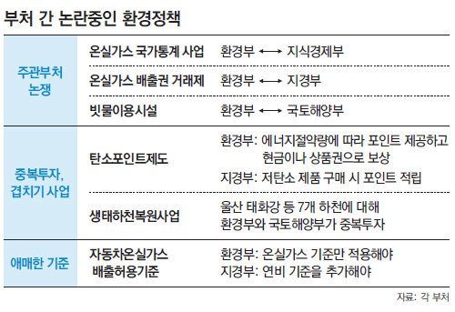 정부가 추진하는 녹색성장 및 환경정책이 부처 간 업무 조율이 제대로 되지 않아 각각 예산을 들여 추진하는 바람에 효율성이 떨어지고 예산 낭비도 심하다. 주관부처 논쟁에 휘말려 시작도 못한 정책도 있다.