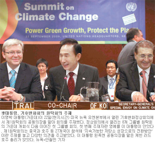 《미국 뉴욕을 방문 중인 이명박 대통령이 ‘녹색 외교’ ‘북핵 외교’에 박차를 가하고 있다. 이 대통령은 22일(현지 시간) 유엔기후변화 정상회의에서 온실가스 감축 문제에 대한 중재안을 제시해 참가국들의 관심을 끌었다. 이에 앞서 21일 미국외교협회(CFR) 오찬간담회에선 선(先) 북핵 폐기를 통한 경제 회생, 후(後) 남북통일이라는 ‘경제적 통일관’을 제시했다.》