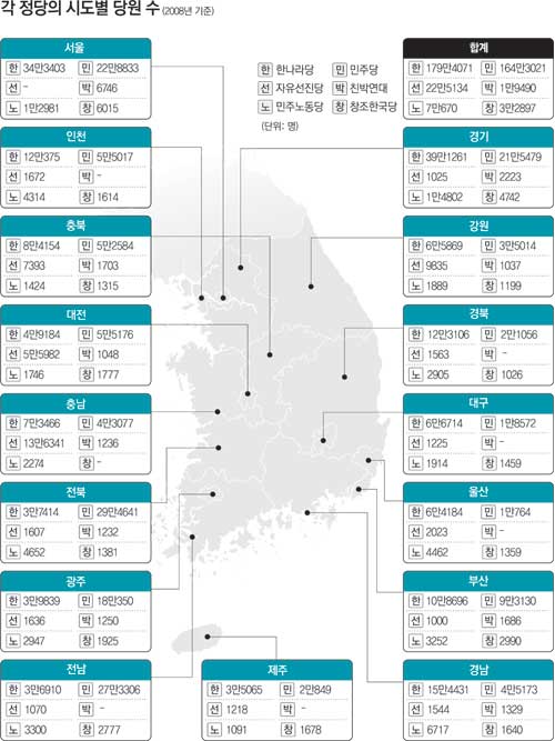 한국 정당은 인구분포와는 무관하게 지지기반인 특정 지역에 따라 당원의 편중 현상이 심한 것으로 나타났다. 유권자 10명 중 1명 정도는 각 정당에 당원으로 가입해 당원 가입률이 유럽의 정치 선진국과 비교할 때 최대 10배 이상 높았다. 이는 동아일보가 25일 중앙선거관리위원회에서 입수한 ‘2008년도 정당의 활동상황 및 회계보고’ 자료를 분석한 결과다. 2007년 대통령 선거와 지난해 국회의원 총선거를 거치면서 한나라당, 민주당, 자유선진당, 친박연대, 민주노동당, 창조한국당 등의 정당 구조가 형성된 이후 각 당의 당원 수가 공개된 것은 처음이다.
