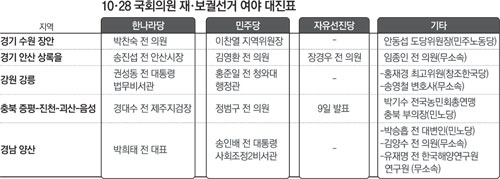 한나라당이 8일 충북 증평-진천-괴산-음성 국회의원 보궐선거 후보로 경대수 전 제주지검장을 낙점하면서 10·28 국회의원 재·보궐선거 5곳에 대한 원내 1, 2당의 대진표가 완성됐다.