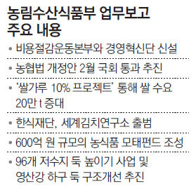 농림수산식품부는 30일 이 같은 내용을 담은 2010년 업무계획을 이명박 대통령에게 보고했다. 농식품부는 비용 절감을 통한 농어업 경쟁력 강화 방안도 마련했다. 생산비의 절반 이상을 차지하는 사료비를 줄이기 위해 한우 출하 월령을 현행 30개월에서 27개월로 줄이기로 했다.