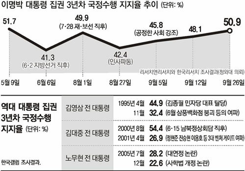 하지만 여당의 6·2지방선거 참패 직후 41.3%로 추락한 뒤 7, 8월 등락을 반복했다. 이어 7·28 재·보궐선거 승리 직후인 8월 1일 조사에서 49.9%까지 회복하더니 국무총리 후보자 등의 ‘인사파동’을 거치며 8월 말 42.4%로 추락했다. 그러나 8·15 광복절 경축사에서 제시한 ‘공정한 사회’ 국정 기조가 먹혀들면서 지지율도 서서히 반등했고 추석 연휴 직후 조사에서 50%를 넘어선 것이다.