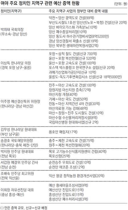 ○ 주요 정치인 지역구 예산도 ‘쏠쏠’