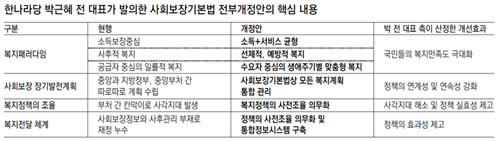 박 전 대표는 성균관대 안 교수를 비롯해 서울대 최성재 안상훈 교수 등 외부 전문가들과 함께 2년에 걸친 준비 끝에 사회보장기본법 전부개정안을 내놓았다. 박 전 대표가 일찌감치 대선주자로서 비전 제시에 나서자 야권은 긴장하고 있다.