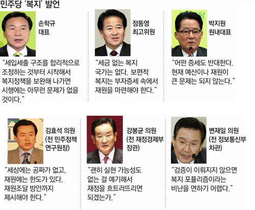 당내 곳곳에서 손학규 대표와 당 정책위원회가 주축이 된 무상복지 정책에 대해 다른 목소리가 나오고 있기 때문이다. 당내 정체성 대립이 가시화되면서 손 대표 체제가 새로운 시험대에 서게 됐다는 분석도 나온다.