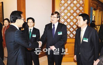 이명박 대통령(왼쪽)이 27일 청와대에서 열린 2011년 녹색성장위원회 업무보고에서 피터 한센 주한 덴마크대사와 악수를 하고 있다. 녹색기술강국인 덴마크는 우리 정부가 주도한 글로벌녹색성장연구소(GGGI)에 참여하고 있다. 청와대사진기자단