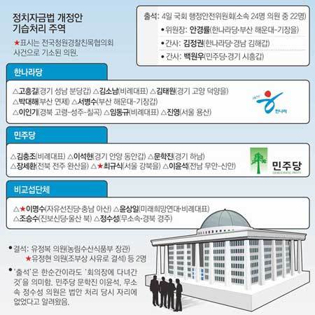 국회 행정안전위원회의 4일 정치자금법 개정안 처리 과정은 신속하고 치밀했다. 사전에 일정에 없던 법안을 전체회의에 상정해 통과시키면서 제대로 된 논의나 반대 토론 한 번 없었다. 정치권에서는 “우리 해군이 아덴 만 해적 소탕을 위해 벌인 ‘여명작전’ 같았다”는 자조 섞인 비판도 나왔다.
