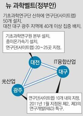 연구단의 40개 이상을 대전과 대구 광주에 집중 배치한다는 점에서 ‘삼각벨트’라는 개념이 나온다. 다만 대전이 과학벨트의 핵심 요소가 배치된 ‘메이저 거점’이라면 대구와 광주는 일종의 ‘마이너 거점’이 되는 셈이다. 실제 정부는 3조5000억 원의 과학벨트 예산 중 중이온가속기, 기초과학연구원 본부 및 25개 안팎의 사이트랩에 2조3000억 원, 나머지 25개 안팎의 사이트랩에 1조2000억 원을 각각 배정하는 예산 편성안도 마련해놓은 것으로 알려졌다.