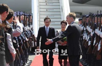 李대통령 부부 베를린 도착 이명박 대통령 내외가 8일 오후(현지 시간) 유럽 순방 첫 방문지인 독일 베를린의 테겔공항에 도착해 독일 정부 관계자의 영접을 받고 있다. 베를린=김동주 기자 zoo@donga.com