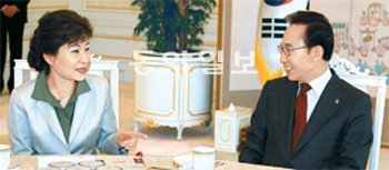 박 전 대표는 이날 “성장의 온기가 국민 모두에게 골고루 와닿도록 해 달라” 등 당 안팎의 여론을 이 대통령에게 상세히 전달했다. 민생 이슈와 관련해 할 얘기를 수첩에 빼곡히 적어간 것으로 알려졌다. 이런 건의에 이 대통령도 적극 호응했다는 게 박 전 대표의 설명이다. 나아가 이 대통령은 박 전 대표에게 “(당과 나라를 위해) 힘써 달라”고 말했다는 것이다.