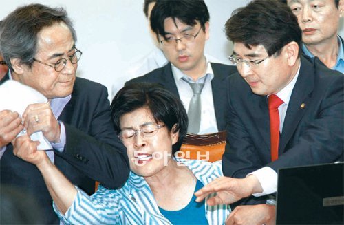 22일 국회 문화체육관광방송통신위원회에서 전재희 위원장(가운데)이 KBS 수신료 1000원 인상안을 상정하려 하자 민주당 최종원 의원(왼쪽)이 의사진행 문안을 빼앗고 있다. 전 위원장은 최 의원이 의사봉도 빼앗자 손바닥으로 단상을 두드려 안건을 상정했다. 이후 여야는 원내수석부대표 간 협의를 거쳐 28일 문방위 전체회의에서 KBS 수신료 인상안을 표결 처리하기로 합의했다. 민주당 측은 “물리적 저지를 하지 않기로 했다”고 밝혔다.