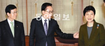 “한 말씀 하시죠” 이명박 대통령(가운데)이 22일 청와대에서 열린 여야 교섭단체 대표, 원내대표 회담에 앞서 한나라당 박근혜 비상대책위원장(오른쪽)에게 발언을 권하고 있다. 왼쪽은 민주통합당 원혜영 공동대표. 청와대사진기자단