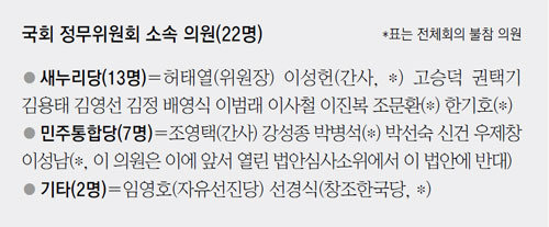현재 정무위원장은 부산 북-강서을이 지역구인 허태열 새누리당 의원이다. 광주 서갑이 지역구인 민주통합당 조영택 의원은 야당 간사다. 정무위 법안소위에는 이진복 새누리당 의원(부산 동래)이 들어가 있다.