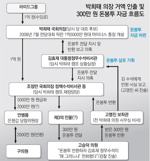 이날 김 수석이 전격 사퇴 의사를 밝힌 데다 박 의장이 전당대회 직전 대출(마이너스) 통장을 만들어 선거 캠프에 전달한 정황이 포착되면서 검찰 수사가 급진전되고 있다.